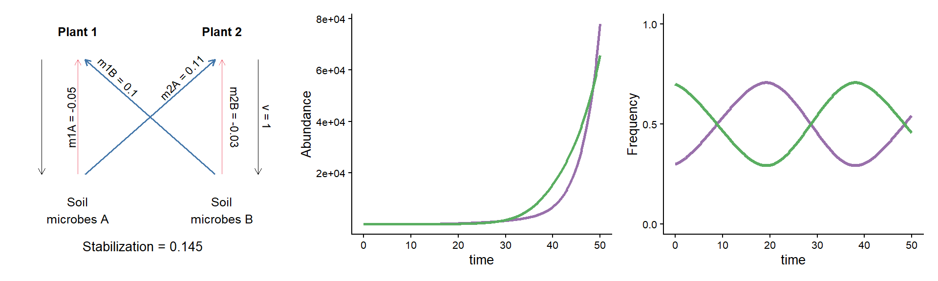 Interpretation: Soil communities grow at a rate determined by the frequency of each plant (and the relative strength of each plant’s conditioning effect, \(\nu\)).