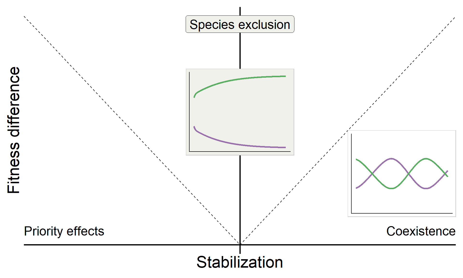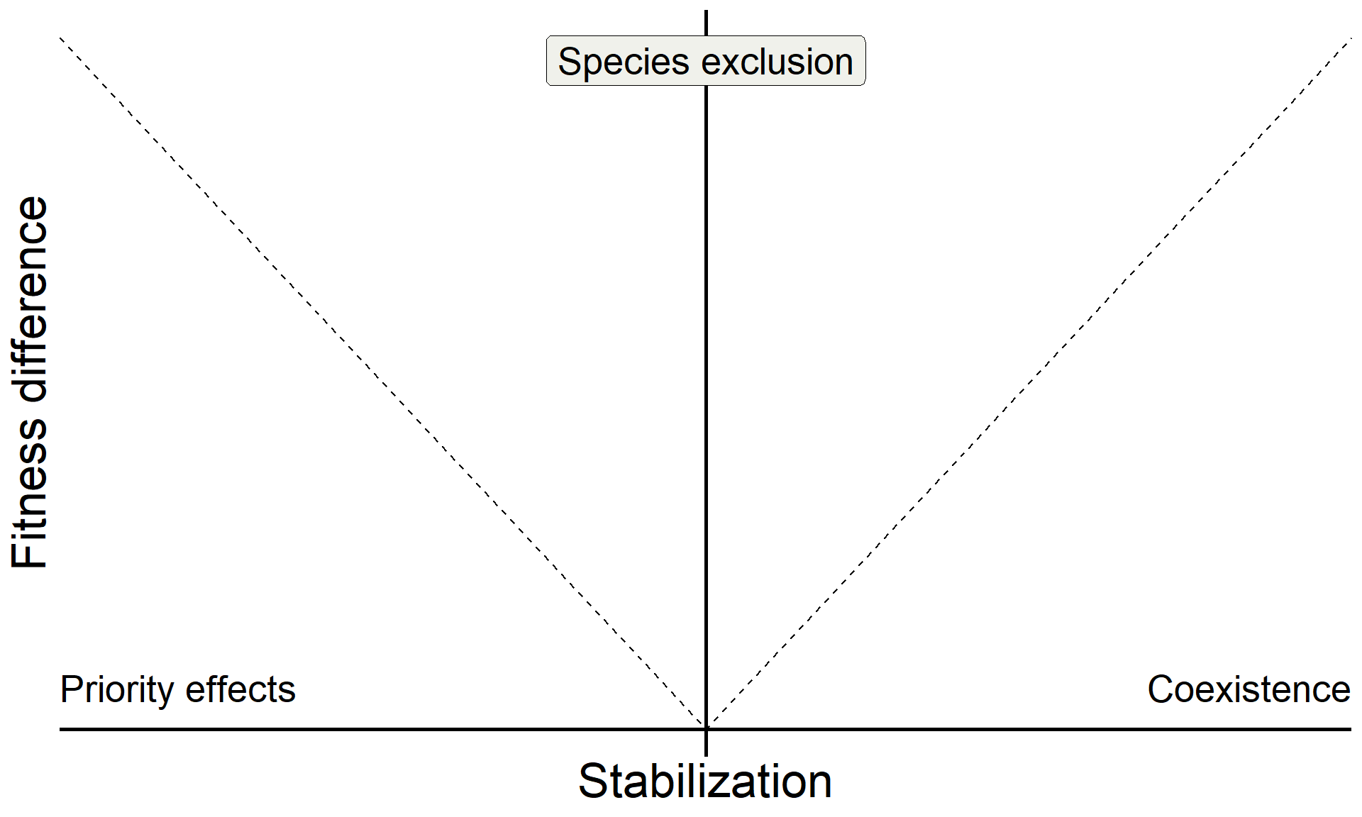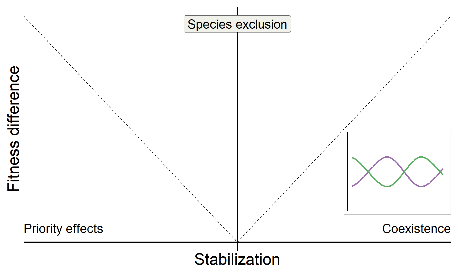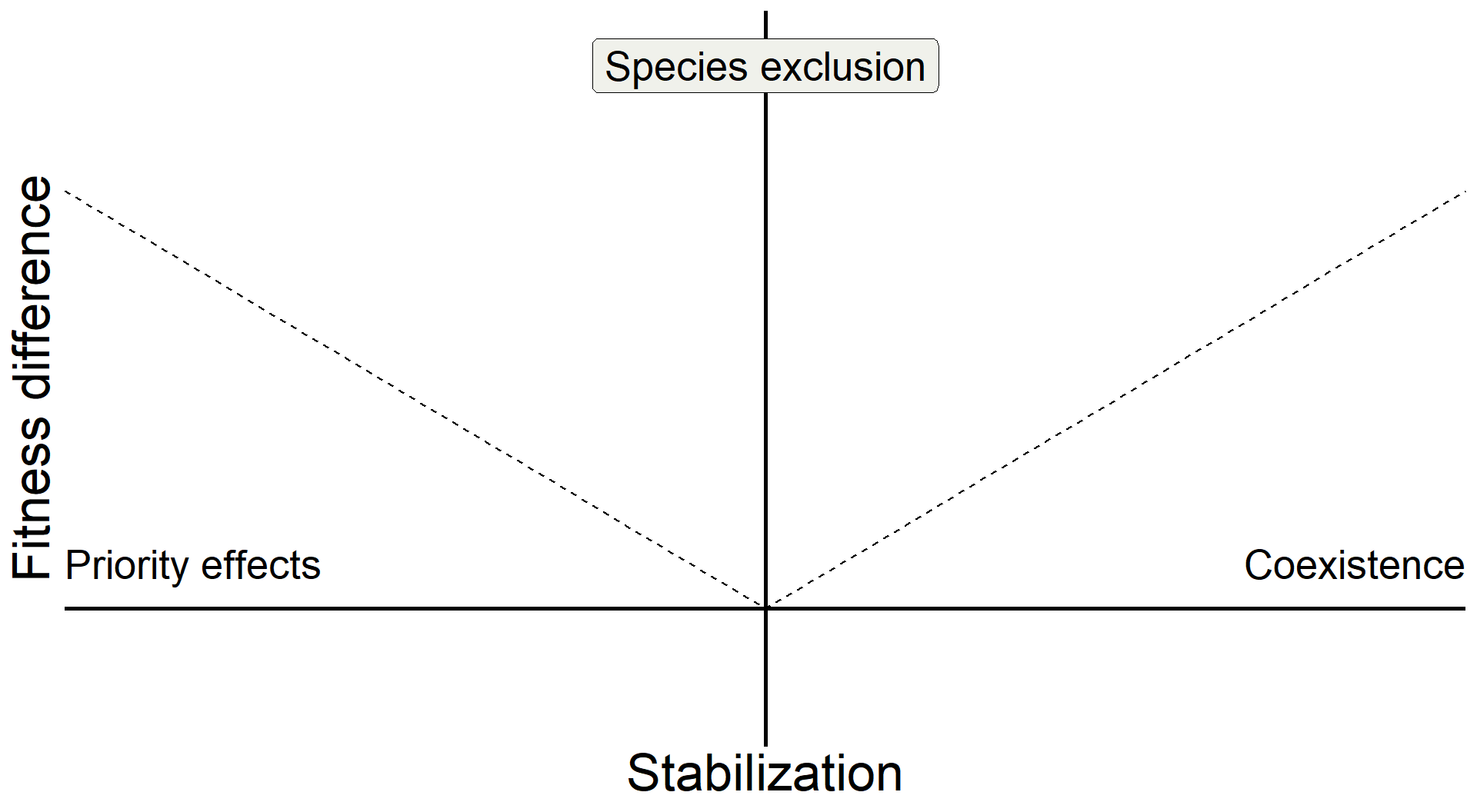 \[ \underbrace{\frac{1}{2}\big[\overbrace{(m_{1B} + m_{2A})}^{\text{interspecific effects}}- \overbrace{(m_{1A} + m_{2B})}^{\text{intraspecific effects}}\big]}_{\text{Stablization}} > 0 \]