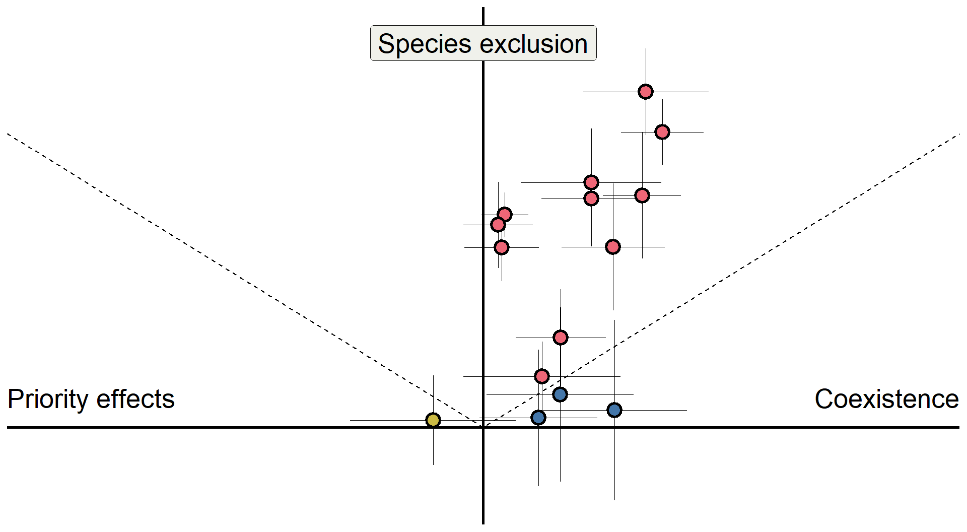 }\[ \overbrace{(m_{1B} + m_{2A})}^{\text{interspecific effects}}- \overbrace{(m_{1A} + m_{2B})}^{\text{intraspecific effects}} > 0 \]