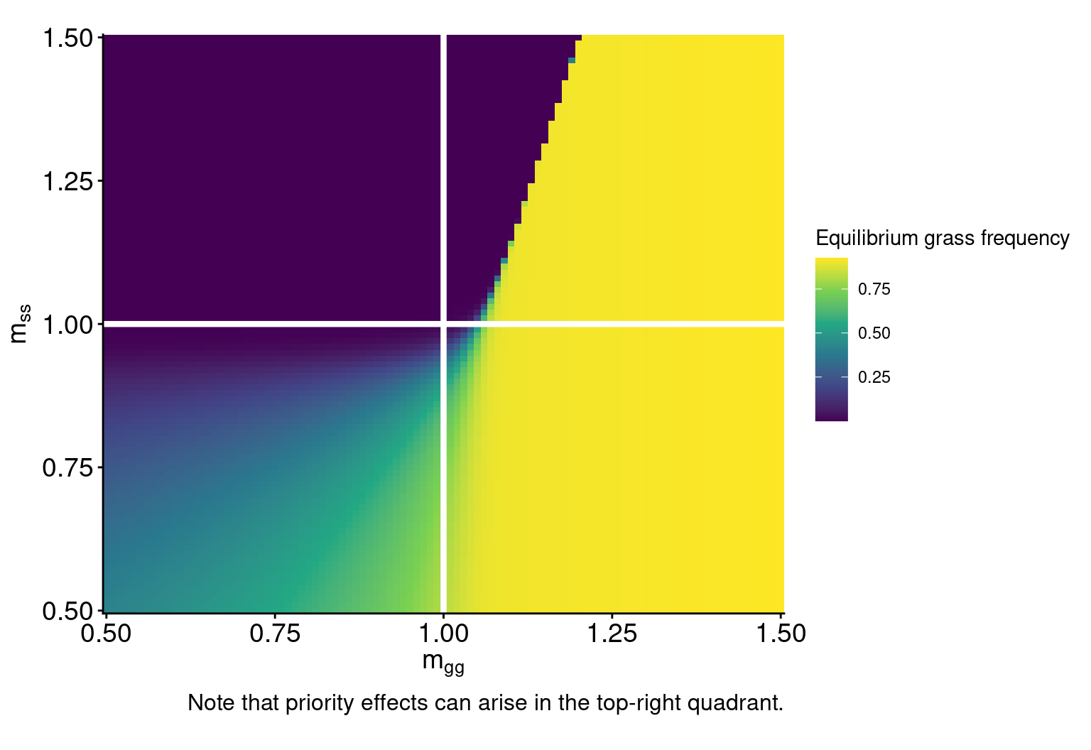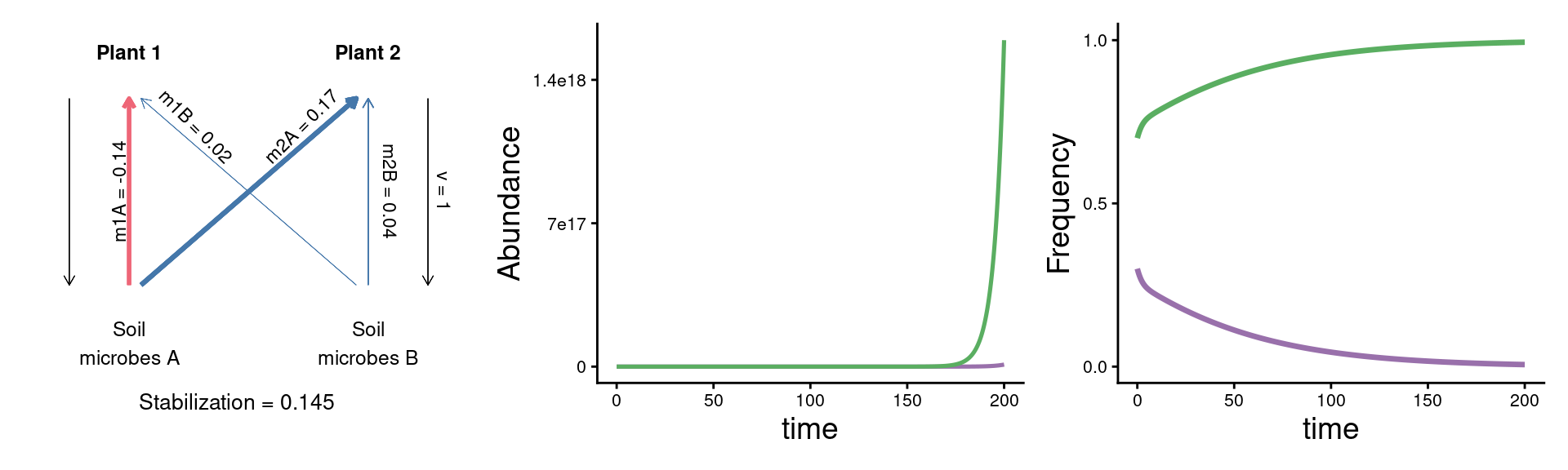 Interpretation: Soil communities grow at a rate determined by the frequency of each plant (and the relative strength of each plant’s conditioning effect, \(\nu\)).