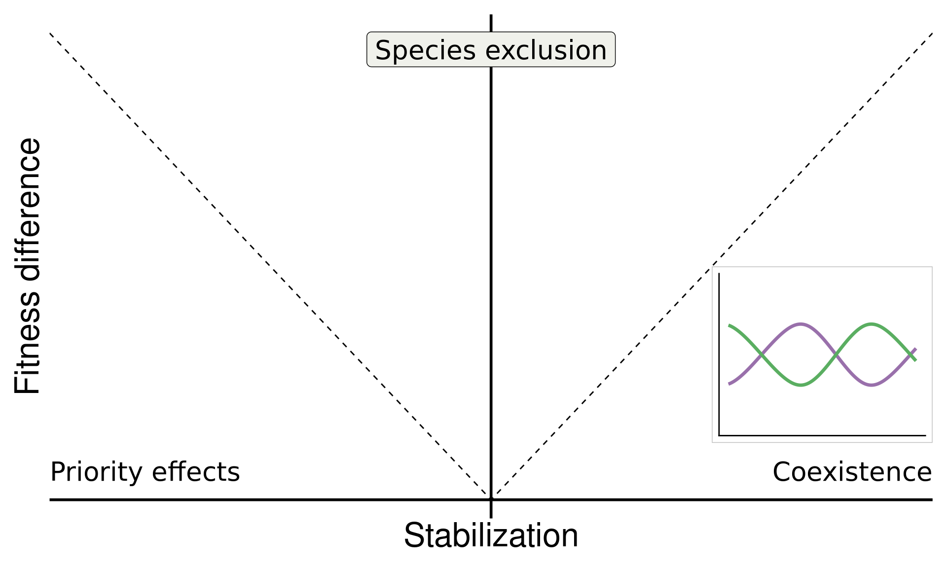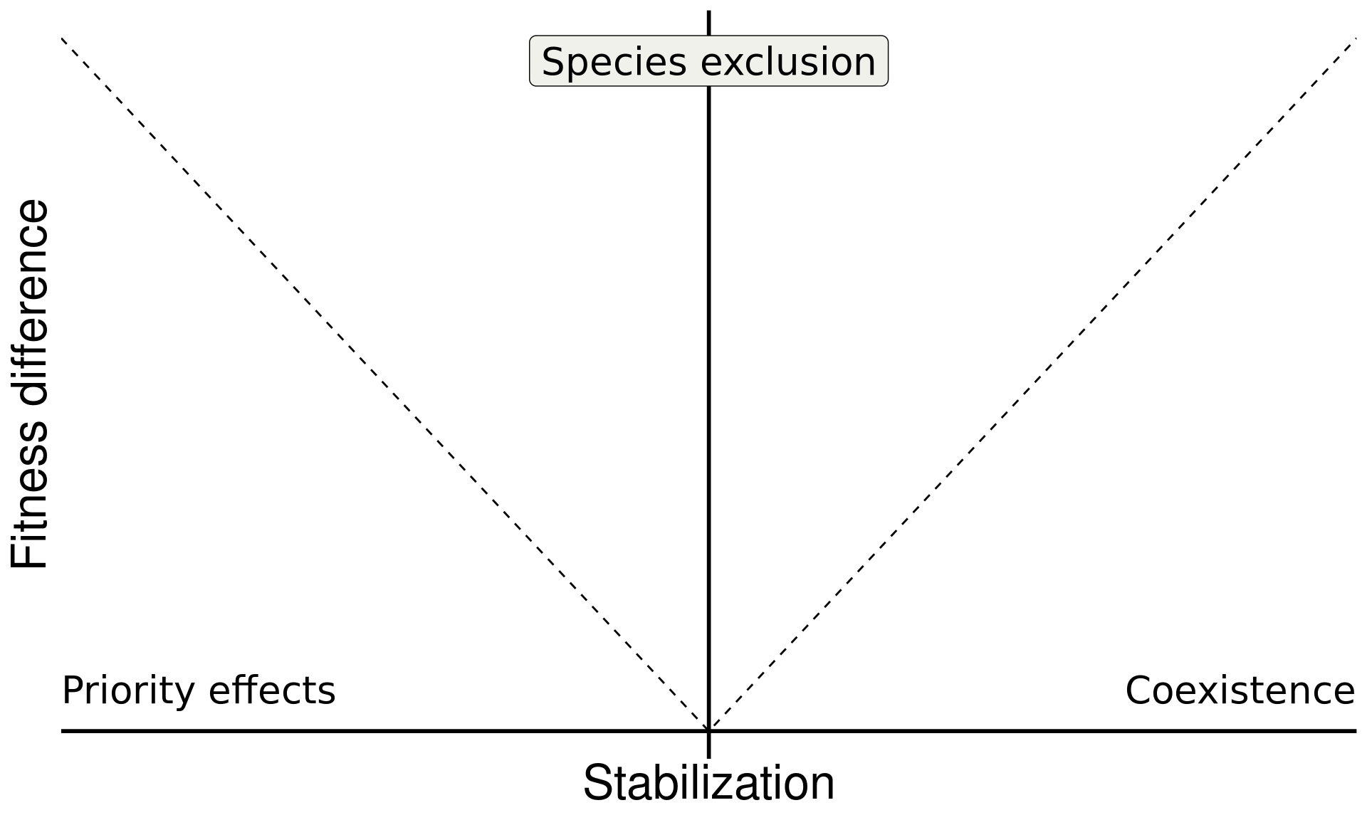 \[ \underbrace{\frac{1}{2}\big[\overbrace{(m_{1B} + m_{2A})}^{\text{interspecific effects}}- \overbrace{(m_{1A} + m_{2B})}^{\text{intraspecific effects}}\big]}_{\text{Stablization}} > 0 \]