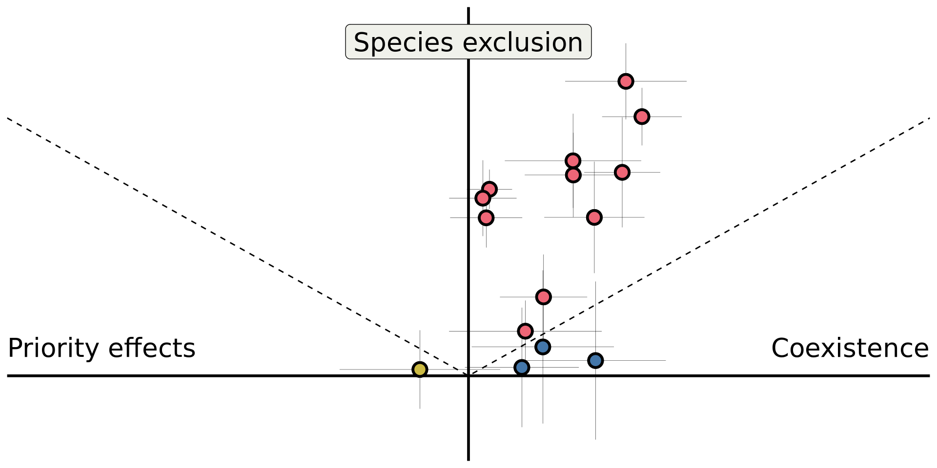 }\[ \overbrace{(m_{1B} + m_{2A})}^{\text{interspecific effects}}- \overbrace{(m_{1A} + m_{2B})}^{\text{intraspecific effects}} > 0 \]